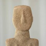 The 15 works on display in Athens are striking. One 34-inch female figurine retains eyes and eyebrows in low relief. A diminutive female figure standing on the head of a larger one is one of only three known in existence. A marble head bears traces of painted red dots on its cheeks and neck as — like later ancient Greek sculpture — many of the Cycladic figurines were initially colored.
