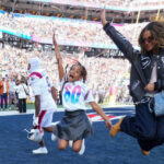 Stars including Travis Scott and Jay-Z were on the sidelines ahead of the game. Jay-Z’s daugther, Blue Ivy, leaped in one of the end zones to take a photo.