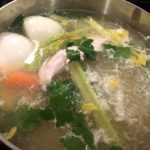 Next, I add the raw chicken breasts — four or five maximum. I bring it all to a rolling boil and let it boil for about one minute. Then I turn the heat off, put a lid on the pot and let it sit for an hour.