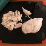The chicken breasts absorb the flavors of the stock as they sit and cook, and become plump and tender. They are very easy to shred with your fingers at this point.