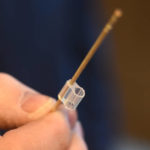 The scion is placed on top of the rootstock and then a transparent plastic grafting clip is attached to hold the two plants together. Being able to see through the clip allows for the perfect union between rootstock and scion. He also uses a thin dowel rod on the clip, which acts as a tiny stake, helping to support the plant as the graft heals.