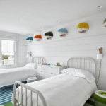 New York designer Ghislaine Vinas recently did a project out in the sandy seaside enclave of Montauk, N.Y. A fresh palette of white and blue was accented with Vinas’ signature punches of bright orange, green and yellow. Beach-chair-style stripes of color adorn furniture pieces and shower tile. Porthole-style mirrors in various iterations anchor bathroom vanities. And scattered throughout the home are nautical references given a playful spin. For example, in the open plan living area, Vinas hung a group of white sphere light fixtures suspended in blue netting; they look like boat buoys.