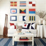 At Ballard Designs, there’s a mirror framed in faux white coral that would make a statement; it’s available in wall-mountable and floor sizes. Suzanne Kasler’s bold, graphic nautical flags come framed in natural wood.
