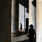 The Jefferson Memorial itself is mostly a peaceful place, with visitors sitting on the sun-kissed marble steps, overlooking the water and the Washington Monument beyond, or marveling at the 19-foot statue of Thomas Jefferson inside.