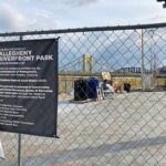 Freshly planted trees and new pavers are easily visible through the chain-link fence that is keeping people out of Downtown Pittsburgh’s Allegheny Riverfront Park while renovations are underway.
