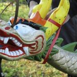 Traditionally, each boat has an ornately carved dragon’s head at the bow and a tail for the stern. The hull is painted with dragon scales. The race begins with a ceremonial eye dotting, or painting, of the dragon’s eye onto the boat.