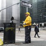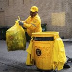 Then, he reached his gloved hands into a metal trash can, tied off the overflowing bag and replaced it with a new one.
