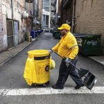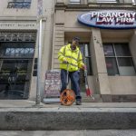 Sam Williams rolled a yellow garbage can down the sidewalk in Pittsburgh’s Market Square, pausing to grab his broom and sweep up some debris.