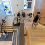 Common areas feature seating for students, and there’s even a small stage underneath the open staircase — inspired by the former grand spiral staircase in the former middle school on Benedum Road.