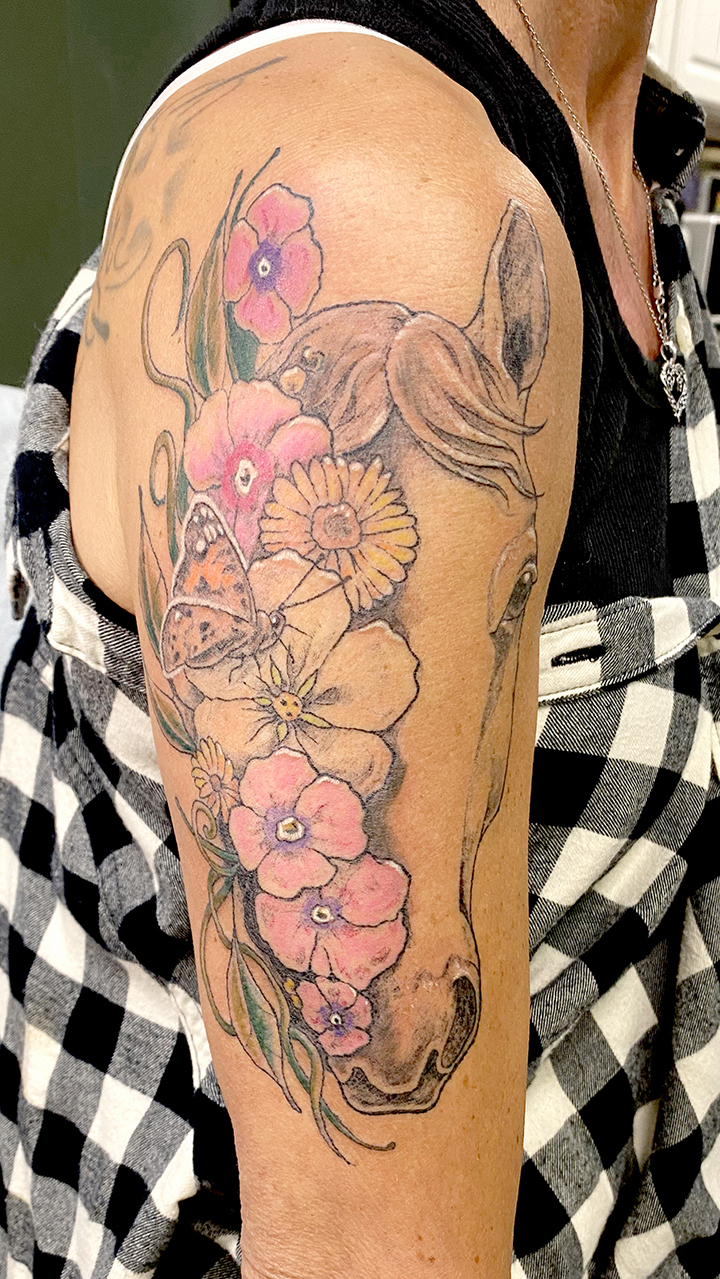 The garden inspired a new set of tattoos — flowers in eye-popping pink, the symbolic butterfly and Taylor’s horse Lydell — that sleeve half of Heather’s right arm.