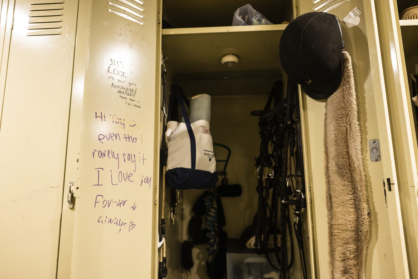 Shortly after the crash, Heather McCandless, Taylor’s mom, removed saddles from Taylor’s lockers. The remaining contents have not been touched. Taylor’s black riding boots sit on the locker floor. A message written in purple marker remains scrawled on the inside of one of her lockers, like it could have been written yesterday.