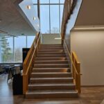 A new, nonspiral staircase leads to the mezzanine reading level and to the upper level of the library. The former spiral staircase located in the main entrance was found to be unfavorable to patrons and staff.