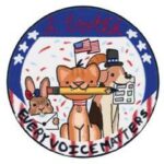 Mya P.’s design features a red-white-and-blue border and an animal trio — a rabbit, cat and dog — each looking very prepared to vote. The sticker also includes the phrase “Every Voice Matters.”