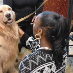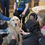 Gordie, a golden retriever, and Fergus, a black Labrador, met with students in groups Feb. 28 and accepted lots of pets and hugs.