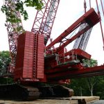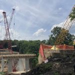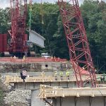 Four large columns that were visible from the ridge near the bridge site were constructed sometime in the seven months since the bridge collapse. Just after the news conference ended, a 150-foot-long concrete beam was hoisted between a column and the west side of Fern Hollow, then slowly lowered and put into place. Another beam was set to be placed Monday.