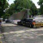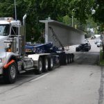 The two beams were built at Pennstress in Blair County and then transported by truck into the city, where they were carried along I-579, the Boulevard of the Allies and Forbes Avenue to the western edge of the bridge site. The former bridge carried Forbes Avenue over Fern Hollow in Frick Park, as the new one also will.
