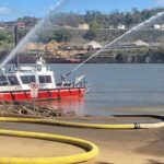 Nearly two dozen firefighters took to the Monongahela River near the South Side on Wednesday to practice fighting fires on and with water from the city’s largest water supply — its rivers.
