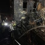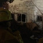 At 11:30 p.m., firefighters were hosing down the charred remains of the house where the fire began.