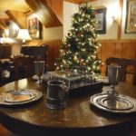There is a Fraser fir Christmas tree adorned with festive ornaments and decorative bulbs and greenery throughout the house.
