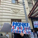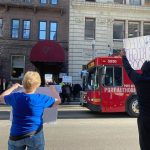 He and dozens of others held signs with slogans like “God’s law trumps PAT’s mandates,” “Let us drive” and “Remember when we were heroes?” Dozens of Port Authority buses and other vehicles honked in support.