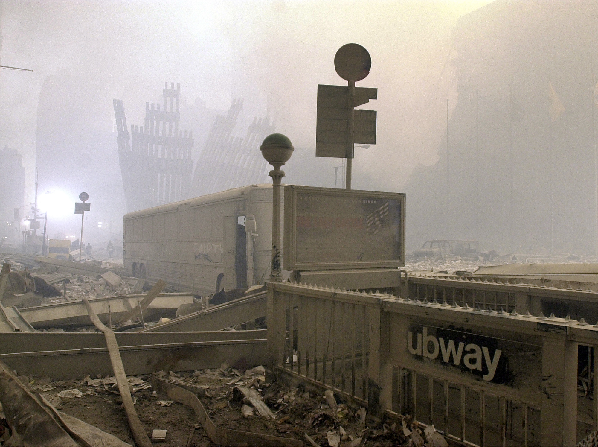 A bus and subway entrance stands dust covered after the terrorist attack on the twin towers on Sept. 11, 2001. (AP)