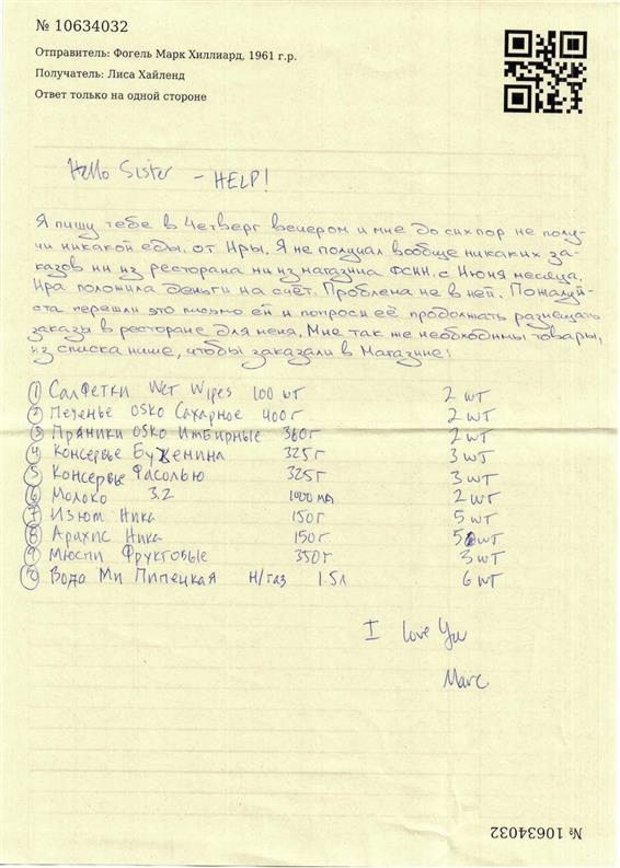 They sent funds to Marc’s friend and translator, Irina Pigman, a Russian who lived part-time in Florida with her American husband. Irina, in turn, would forward the money to a former inmate living in exile near the prison, who bought food and other supplies for Marc.