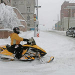 Nick Senella of Greensburg waits for the light to change at the intersection of Pennsylvania Avenue and Pittsburgh Street on his snowmobile on a snow-covered tour of downtown Greensburg on Saturday, Feb. 6, 2010.
