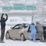 A snowbound motorist headed for the Parkway East gets push from a group of Squirrel Hill pedestrians on Saturday, Feb. 6, 2010.
