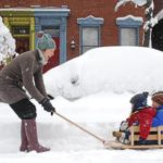 Denise Mahone pulls her sons Eamonn, 2, and Gabriel, 15 months, in a sled along Taylor Street in the Mexican War Streets on Pittsburgh’s North Side on Saturday, Feb. 6, 2010.