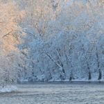 Snow-covered trees line the Youghiogheny River in Connellsville as the sun sets on Monday, Feb. 8, 2010.