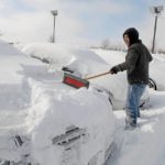 Anthony Paluzzi, 19, of Greensburg, an amployee of Arnold Palmer Motors in Latrobe, works to clear off snow from the some 100 plus cars on the lot Monday, Feb. 8, 2010.