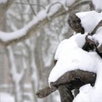 A bronze statue of Stephen Foster, created by Giuseppe Moretti, sits beneath several inches of snow in Oakland on Tuesday, Feb. 9, 2010.