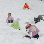 Clockwise from bottom: Morgan Stupar, 11, and her sisters Miya, 5, and Michaela, 9, play in the snow with their cousin Amanda Stupar and their dog Brock in their front yard on Jackson Court in Murrysville on Wednesday, Feb. 10, 2010.