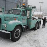 Using a vintage wrecker, Sam Lydic attempts to pull a tractor-trailer out of a snow bank on Butler Street in Springdale on Wednesday, Feb. 10, 2010.