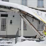 Craig Gates, a firefighter with the Connellsville Fire Dept., begins to remove accumlated snow off of the porch roof that collapsed from the weight of the snow at 516 N. Pittsburgh St. in Connellsville on Thursday, Feb. 11, 2010.