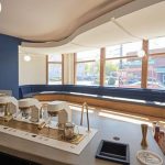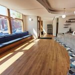 The 1,400-square-foot first-floor space has plenty of natural light and built-in bench seating along the wall. The front custom counter is made of concrete.