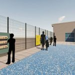 The courtyard will include a basketball hoop, four-square, turf playing area, climbing wall and shade.
