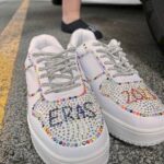 Chelsey Daugherty of Muncie, Indiana displayed a pair of shoes she made for the concert while Tay-gating in Lot 5 outside of Acrisure Stadium Friday.