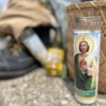 A set of black rosary beads were draped near a card signed “In loving memory, XOXO.” One visitor left a votive candle wrapped in a portrait of Saint Jude, the Christian patron saint of lost causes.