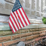 The top and bottom of the memorial’s bronze plaques were painted silver, and paint dripped onto veterans’ names and the U.S. flags on the ground. Medallions on flag holders on the ground and atop the monument were also painted silver, as was an eagle at the top.