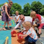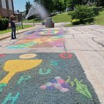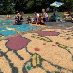 Tom Due of Tarentum volunteered to help wet down the carpets and help participants with supplies. He said Artcraft Wood Products in Pittsburgh donated the sawdust. Volunteers dyed the sawdust with all the colors of the rainbow earlier in the week.