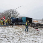 State police Tpr. John Pomaybo said the driver reported he was going around 30 miles per hour when he felt the truck lose control as he was going down the curved exit ramp. The truck flipped onto its side and the scrap metal it was carrying spilled onto the grassy area between the ramp and Bull Creek Road (Route 366).