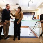 Officials and library patrons gathered for a ribbon-cutting — done with the same gold scissors used when the building originally opened in 2011.
