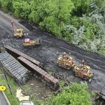 Crews from Washington-based R.J. Corman Railroad Services arrived with heavy machinery to lift the derailed cars.