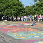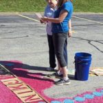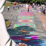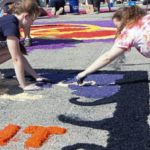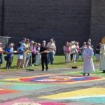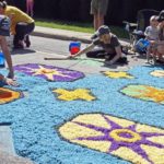 Parishioners from Holy Martyrs Church in Tarentum and other area churches have been creating elaborate carpets made of dyed sawdust to celebrate the Christian holy day of Corpus Christi (the body of Christ) for 76 years. This year, the weather cooperated and dozens of volunteers gathered on Sunday, June 23, 2019, at Holy Martyrs to fashion more than a dozen of the colorful carpets in the church’s parking lot.