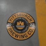 The company’s original 1861 logo stretches across the floor with yellow lines representing the region’s three rivers on it. One of the river lines — the Allegheny River — leads to the circular logo of that reads Pittsburgh Brewing Co., Creighton Facility, Allegheny County, 2022.