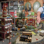 The details in Stawinski’s display are what stand out the most. Miniature figures stand outside the businesses, while Matchbox cars fill the roads and bridges that weave around the tracks. The display includes homemade rock formations and bits and pieces of things Stawinski would find on his mail route.