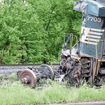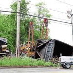 The eastbound train hit a heavy equipment truck carrying stone at the crossing into a sewage treatment plant along Freeport Road at 3:15 p.m., company officials said.