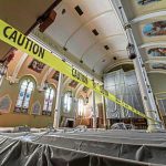 The inside of the sanctuary sustained water damage, including the plaster and murals on the ceiling on the left side.