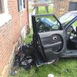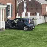 The car apparently descended a grassy hill, crashing through a wooden fence, before wrecking into the foundation of the Overholt building. A wrecker towed the Kia away.